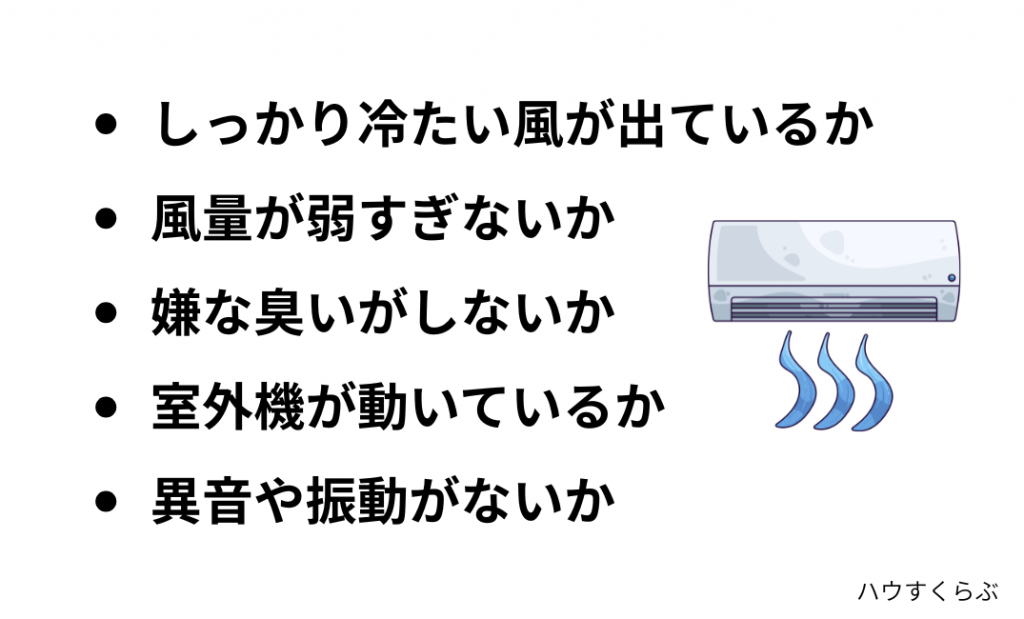 設定温度を低め、風量は強めにして10分ほど運転し、以下をチェックしてみてください。