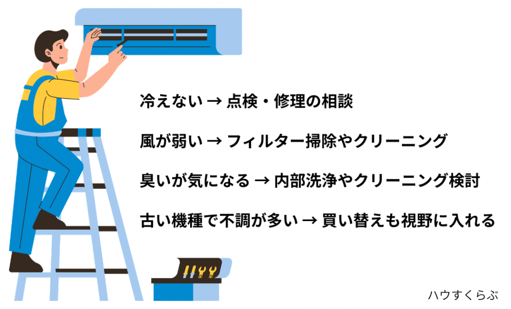 また、風が弱い場合はフィルターや内部の汚れ、臭いが気になる場合はカビやホコリが原因になっていることもあります。